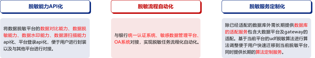 ■ 工具能力灵活调用:具备标准化的数据脱敏、数据水印、数据溯源等能力的API接口,三方应用或平台可方便进行对接整合,提升了产品的使用场景。
