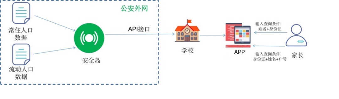 公安掌握学生户籍户口信息、学校通过确认学生户籍信息实现区域入学、“就近入学”。将公安掌握的流动人口数据和常住人口数据安全的加密共享出来,通过AiLand加密原始数据,进入可执行环境计算,当家长输入姓名、身份证号、户号信息,经过“APP”查询信息查询AiLand计算后的结果集,最后通过API接口将加密后的计算结果返回到学校验证学生信息。