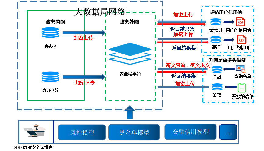大数据局掌握基本信息,包括家庭住址、公积金、住房等信息,银行和金融机构掌握用户银行卡借贷情况。大数据局将所持有的用户个人信息数据加密共享,金融机构和银行将本机构用户银行借贷情况进行加密,加密后的政务数据上传至AiLand进入可信执行环境(BDTee),经过融合计算获取计算后的用户信用值,来确认贷款用户是否存在“多头借贷”的情况。