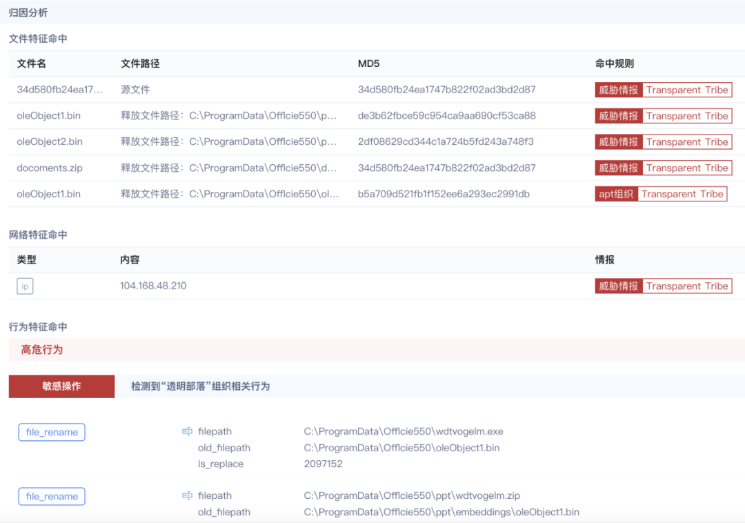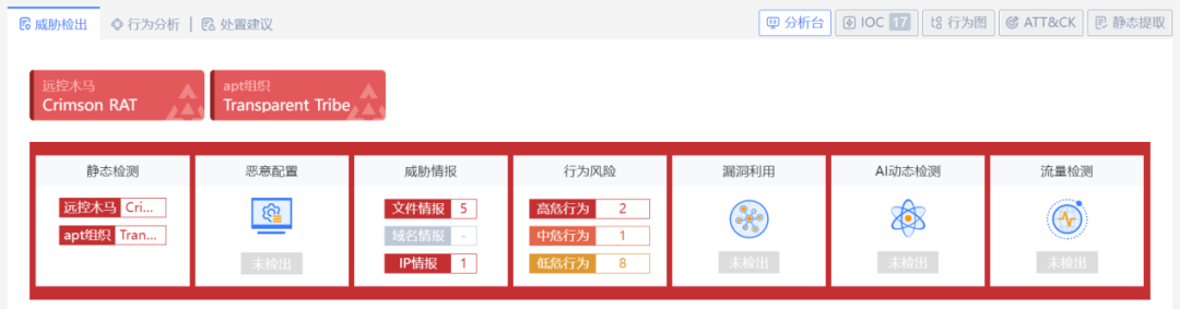 以透明部落组织的一个样本为例,经过安恒云沙箱综合分析,快速获得样本的详细分析信息,从聚合标签中即可判断出样本为Crimson RAT,APT组织为Transparent Tribe(透明部落)。