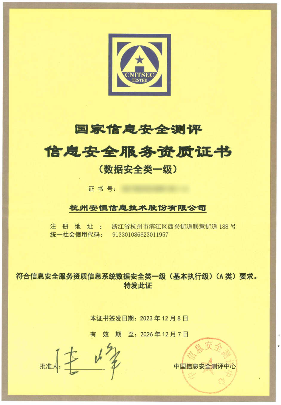 首批获证!安恒信息获得国家信息安全服务数据安全类一级资质
