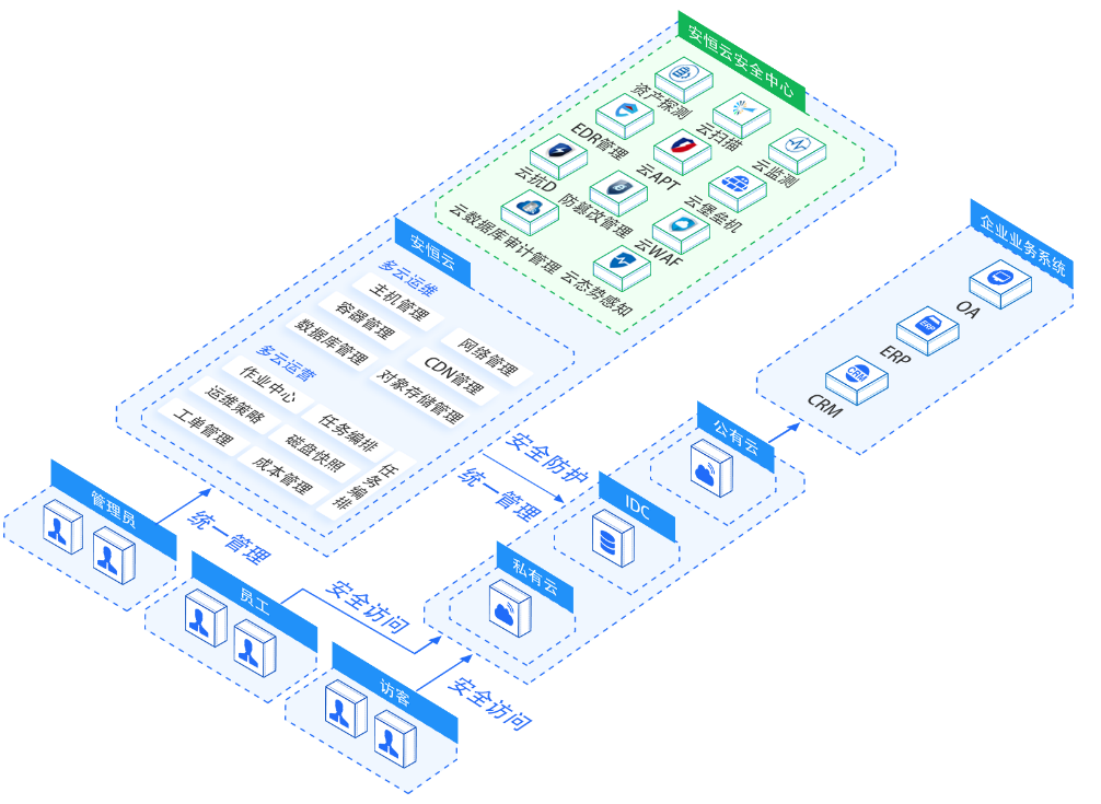 同时由多云安全管理平台根据资产类型提供不同的SaaS化安全能力,构建完整的网络层、应用层、数据层、主机层等整体安全防护体系,对混合云资产进行全方位防护。