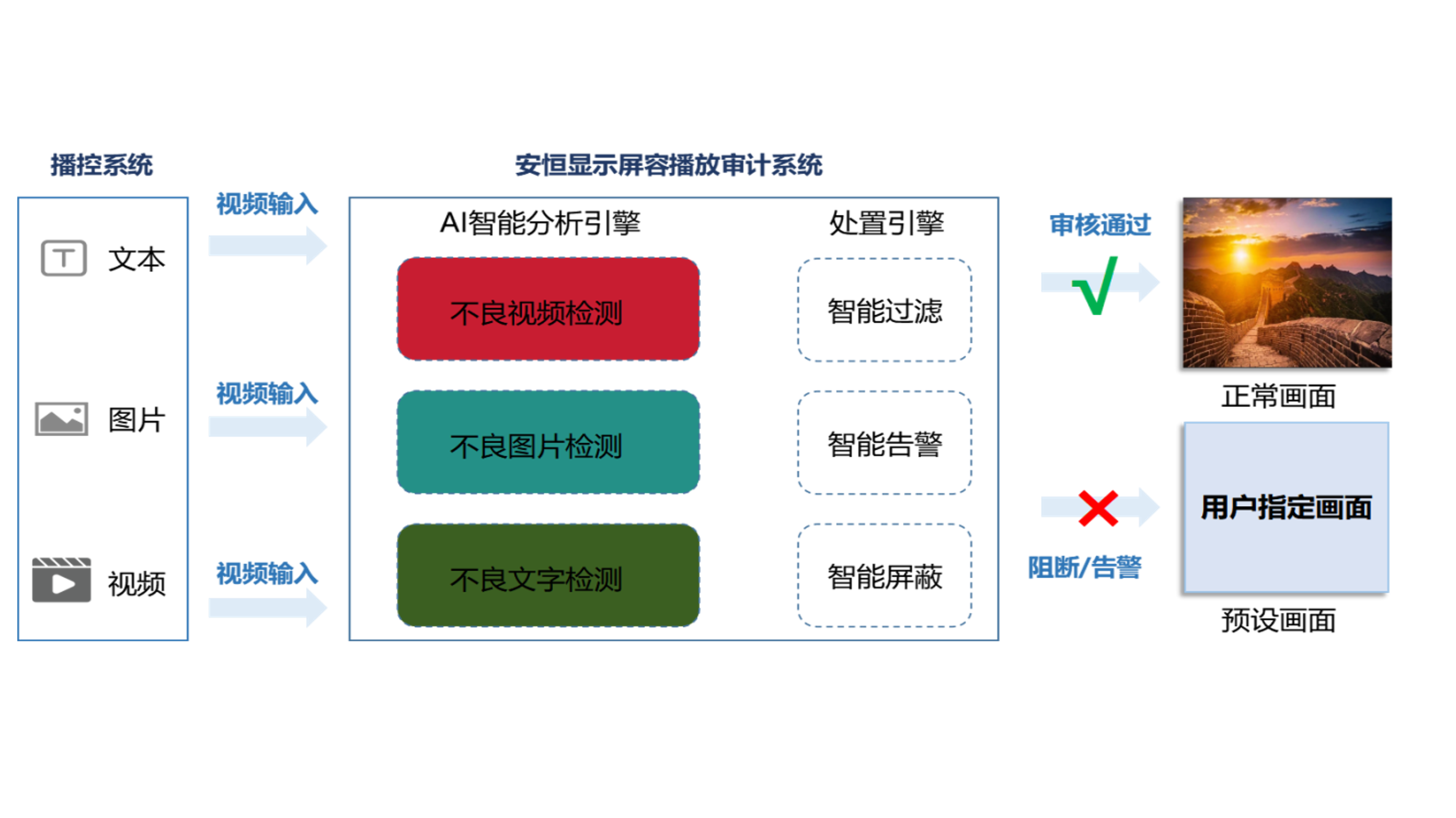 在主控电脑和文字屏之间串接安恒信息显示屏内容播放审计系统,显示屏内容播放审计系统具备边缘计算能力,实时分析显示内容,一旦发现不良内容,立即切换到预制画面。